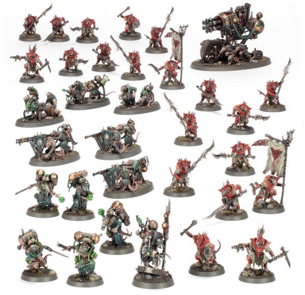 The elite of the Clans Skryre often enlist outside help to keep their vulnerable weapons teams out of harm’s way, and the Skryre Warpswarm goes all out. Its solid core of one Arch-Warlock, five Acolyte Globadiers, three Warplock Jezzail teams, three Warpspark Weapon Batteries, and a clanking Ratling Warpblaster are defended by a mighty retinue of 20 Stormvermin, ensuring their bosses won’t come to harm.