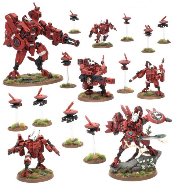 Commander Farsight may be a dangerous radical and subversive revolutionary – if you ask the Ethereals – but he does have excellent taste in battlesuits, and the Farsight Cadre brings his best together in one box. You get Commander Farsight himself, a Broadside Battlesuit, three Crisis Battlesuits, and a Riptide Battlesuit, all with their various drones.
