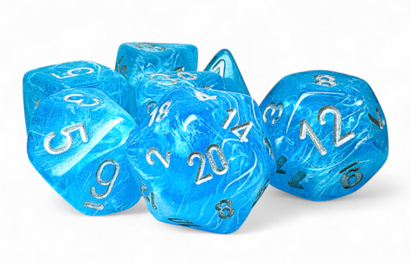 Contains 7 Luminary Sky Dice with silver numbers in the following Shapes:
