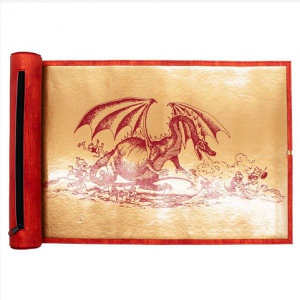 The D&D Dice Scroll Map offers premium dice storage and functions as a dice rolling mat. This Classic Dragon, illustrated by David A. Trampier, is made with a durable Gilded Red leatherette exterior and a golden colored backing for the illustrated rolling surface with 50th D&D ampersands on each end. This soft roll-out mat will safely store your dice and protect your table. The zippered compartment holds 20+ dice. The rolling mat rolls around the zippered compartment and is secured shut with a single tie to look like an ancient leather-bound scroll.