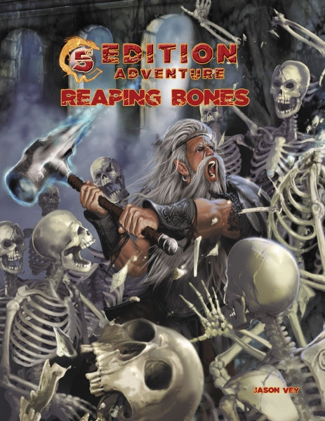 The Tar Kiln, a wild region of wooded hills, cut by deep gulches, where giant blocks of gray stone rise from the upland prairie like islands in the sea. Here streams feed lakes or wild rivers and the sky seems to stretch on forever. But the Tar Kiln is not a kindly place; it is littered with tar pits, constantly oozing the ichors of the world's birth upon the green grasses. And it is home to wild beasts, hunting dragons, bull headed men and tigers so large their fangs are like sabers. And in the midst of all this lie the ruins of an ancient god, Nunt, master of dark places. Only the hardy dwell here. Such is Brian, Lord of Helliwell, who rules his people with benevolent neglect. He asks no more of them than their oaths require, nor does he give them any more than his oaths demand. But herein lies his doom, for to protect his people he’s crossed his King, and suffered the loss of his son. Borne into the wilds of the Tar Kiln by mercenaries, the boy is gone. But Brian must head off to the south to confront his monarch, turning to other to aid his child. So, you find yourselves entering the Tar Kiln, and the wilds, whose echoes carry a terror, that only the bold can face. For in them, lurk monsters from the edge of nightmare. Reaping Bones is a fast-paced pursuit adventure that plunges the characters into the wilds to find a boy whose captures are anything but normal mercenaries. Made in the USA.