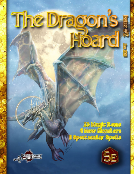 Magic, Monsters, and More! The Dragon’s Hoard is a monthly anthology of magic items, spells, monsters, and more for your 5th Edition campaign! Each issue of The Dragon’s Hoard takes every new magic item, spell, monster, or other new rules content from our ongoing Legendary Loot Patreon and presents it for you, with dozens of new elements beautifully illustrated and ready to unleash on your players! In this month's features you'll find: The Treasure Trove, featuring magnificent magic items like the staff of draconic power, blizzard bottle, candle crown, and the biting blade of ten thousand blossoms! Basker’s Books, featuring new spells for almost every 5E spellcaster like accursed monolith, gate of the faithful, shield of dawn, and wall of light!