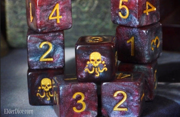 9 d6 dice set, Nebula theme, Seal of Yog-Sothoth symbol, gold paint
