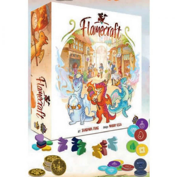In Flamecraft, 1-5 players take on the role of Flamekeepers, gathering items, placing dragons and casting enchantments to enhance the shops of the town. Dragons are specialized (bread, meat, iron, crystal, plant and potion) and the Flamekeepers know which shops are the best home for each.