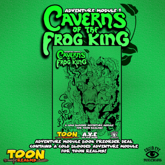 Caverns of the Frog King is system agnostic, meaning that rules are implied and suggested throughout but no attempt has been made to provide a rules framework. These, therefore are ‘rulings’ suggestions, rather than hard and fast rules per se. We call this method ‘Add Your Engine’, (or AYE for short). This has been done so that Games Masters (GMs), may run the module using any rpg (role playing game), system, choosing their favourite or most appropriate. It is a simple matter to accomplish this, so simple for a fairly experienced GM, in fact, that it is entirely possible to run this module ‘on the fly’.